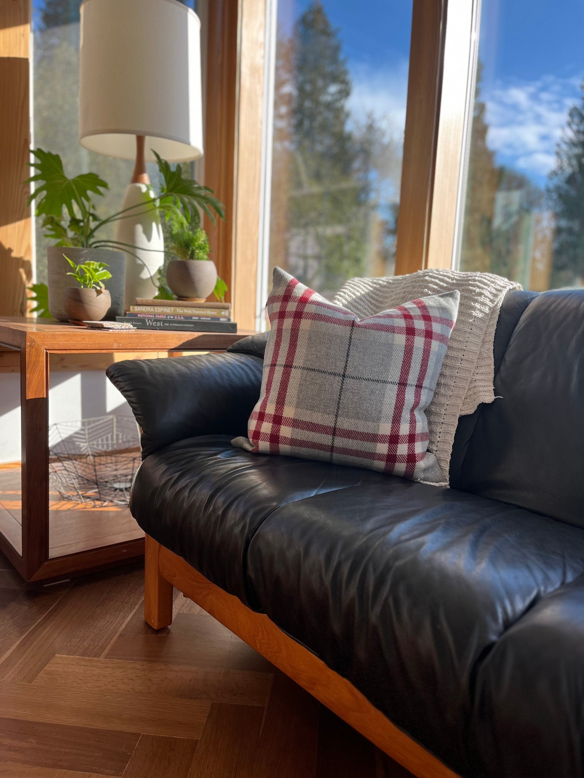 Black and cream plaid wool pillow cover exposed zipper-leather pull 24” 22” 20” 14x24 Handcrafted by misa housewarming gift
